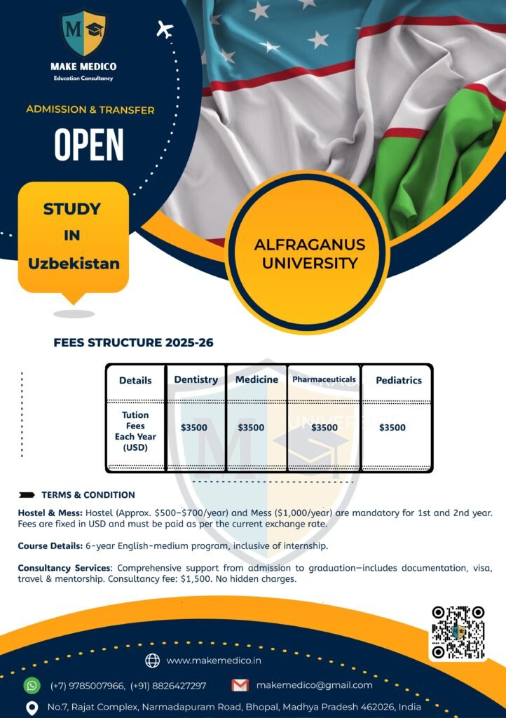 Alfraganus University (AFU) was established in 2022 in Tashkent, Uzbekistan, as a modern private higher education institution with a strong focus on innovation and international standards. It offers undergraduate programs across 8 faculties, including Medicine, along with 37 specializations, and provides master’s degree programs in 10 fields. The Faculty of Medicine was introduced to meet growing demand for quality medical education aligned with global practices. Although newly established, AFU emphasizes digital learning, practical training, and partnerships with healthcare institutions to support clinical education. The university aims to become a regional hub for academic excellence, particularly for students from Central Asia and beyond seeking accessible medical training.